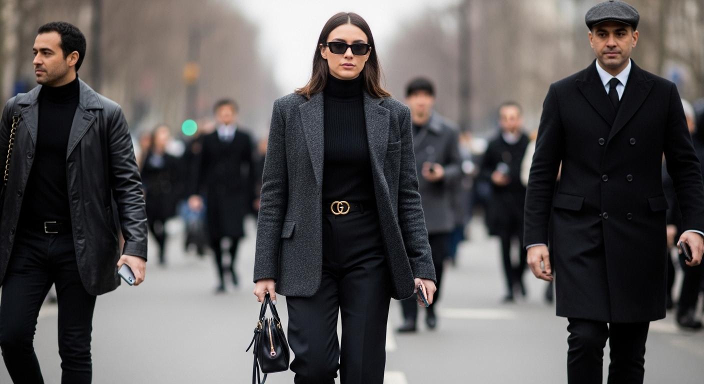 - Layered tailoring dominates the streets: longline blazers over compact silhouettes, with coats that extend the line without overwhelming the frame.